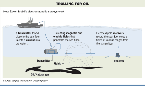 "Oil is a ‘resistive’ material -- a poor conductor of electricity. So when electromagnetic energy waves are sent into the earth, oil-soaked rocks show up as a resistive layer that contrasts with more conductive substances like water-soaked rocks. Schlumberger Ltd. pioneered electromagnetics as the standard for ‘well logging,’ the process of mapping the layers of oil in a newly drilled well. Scientists have nurtured the notion that the same technology could be used to explore for oil from the surface." ...