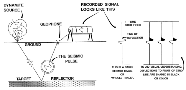 dynamite planted in a borehole or Vibroseis, a vibrating mechanism mounted on